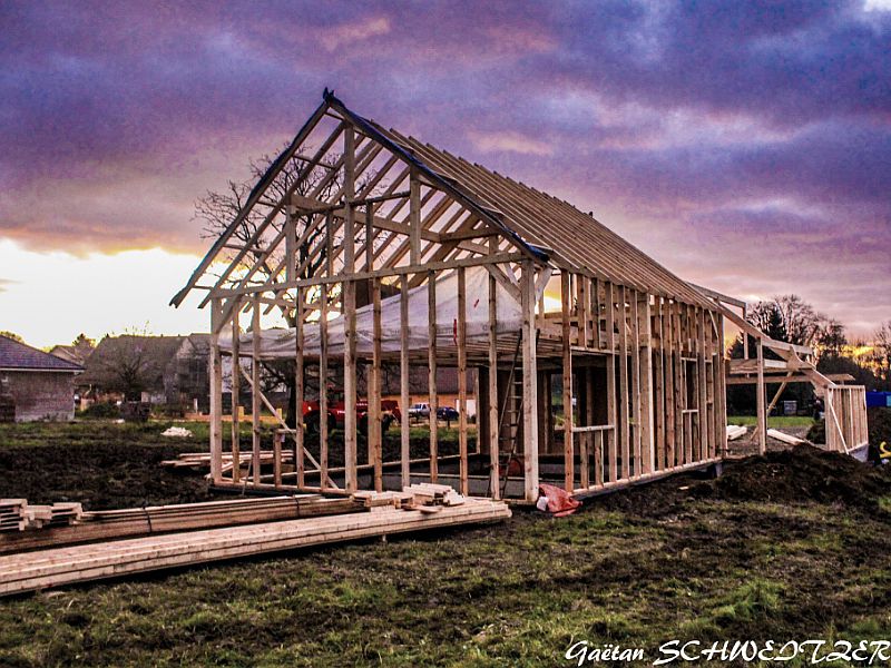 Bardage à clin de type HardiePlank® James Hardie à base de ciment composite (coloris brume du matin) et panneaux de façade, panneaux structurels DFP® 16 mm (contreventement par l'extérieur et pare-pluie), isolation de 360 mm de fibre de bois.